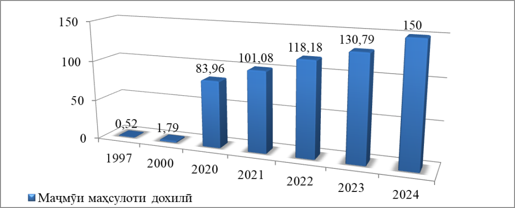 Тибқи маълумотҳои диаграммаи 1 метавон хулоса намуд, ки ҳаҷми маҷмуи маҳсулоти дохилӣ дар соли 2024-ум ба беш аз 150 млрд сомонӣ баробар гардид, ки ин рақам дар соли 1997-ум 518,4 млн. сомониро ташкил медод, ки қиёс нисбати соли 1997-ум 288,5 маротиба зиёд гардидааст. Бояд гуфт, ки нишондиҳандаи мазкур аз натиҷаи сиёсати созанда ва бунёдкоронаи Пешвои миллат муҳтарам Эмомалӣ Раҳмон дарак дода, дар ин замина, сатҳу сифати зиндагии аҳолӣ ба маротиб боло бардошта шуд.