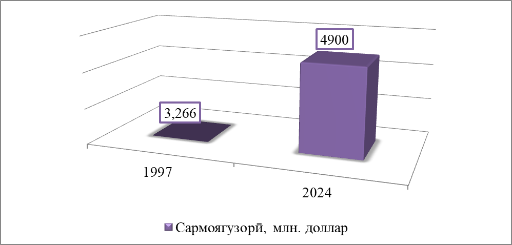Тибқи маълумоти Кумитаи давлатии сармоягузорӣ ва идораи амволи давлатии Ҷумҳурии Тоҷикистон дар соли 2024 ҳаҷми умумии сармояи хориҷии ба Ҷумҳурии Тоҷикистон воридгардида 4,9 млрд. доллари ИМА-ро ташкил намуд, ки ин нисбат ба соли 2023 2,1 млрд. доллар ё 72,7 дарсад зиёд мебошад. Аз ин маблағ ҳаҷми сармояи мустақим 394,3 млн. доллари ИМА-ро ташкил медиҳад, ки нисбат ба нишондиҳандаи соли гузашта 110,2 млн. доллар ё 38,8 дарсад зиёд мебошад [4]. Тибқи маълумотҳои омори расмӣ ҳаҷми сармоягузорӣ дар соли 1997 ба 3,2 млн. доллар баробар буд [2,402].