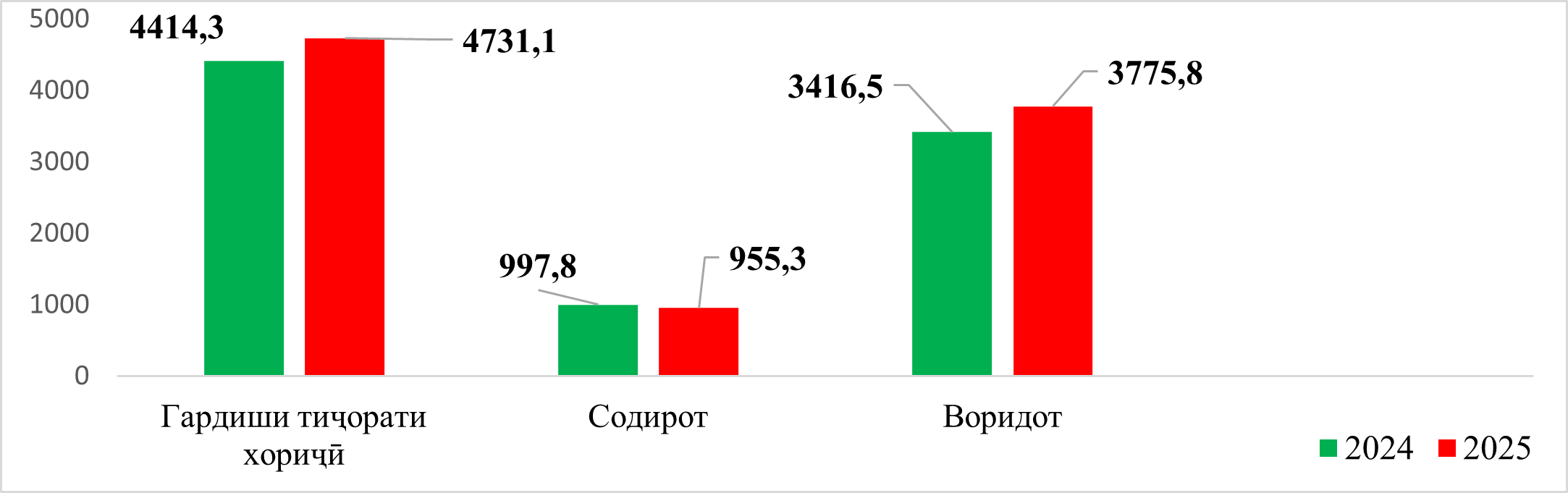 Тибқи маълумоти диаграммаи 1 гардиши тиҷорати хориҷӣ дар давоми моҳҳои январ – июни соли 2025-ум ба 4731,1 млн. доллар баробар гардид, ки нисбат ба ҳамин давраи соли гузашта 316,8 млн. доллар бештар мебошад. Содироти мол дар ин давра маблағи 955,3 млн. долларро ташкил намуд, ки дар муқоиса ба ҳамин давраи соли 2024-ум 4,3 дарсад ё 42,5 млн. доллари ИМА коҳиш ёфтааст. Воридот ба маблағи 3775,8 млн. доллари ИМА баробар гардид, ки нисбат ба ҳамин давраи соли 2024-ум ба андозаи 10,5 дарсад ё ин ки 359,3 млн. доллар зиёд мебошад.
