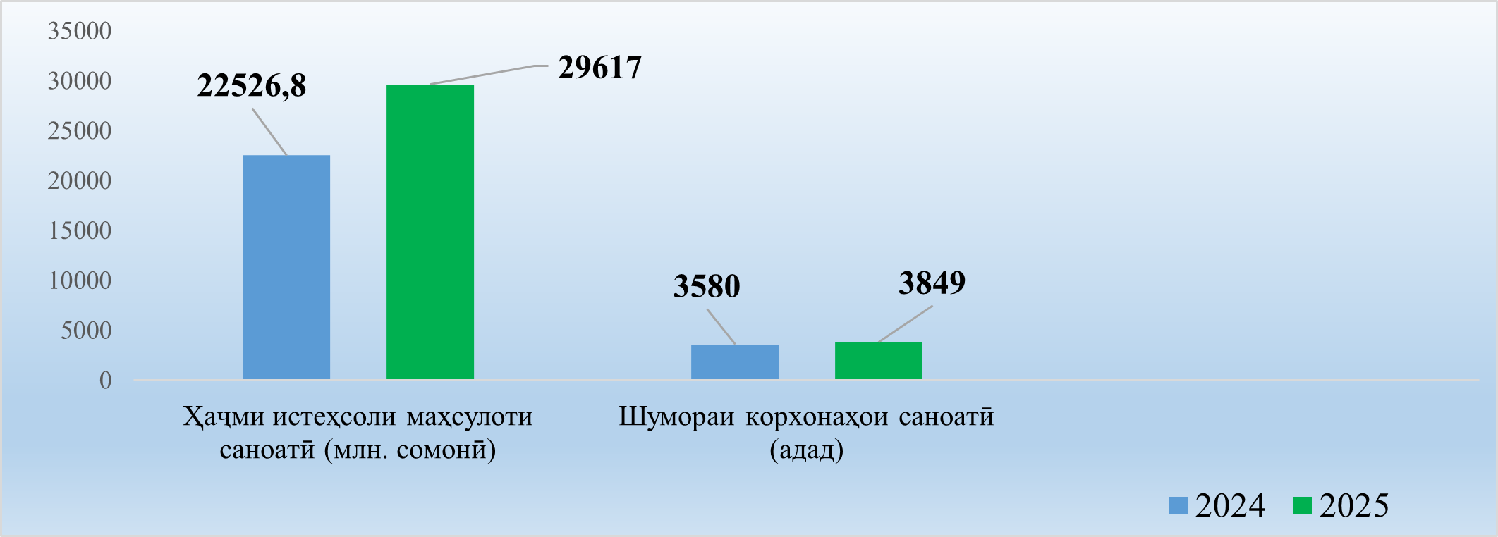 Дар натиҷаи тадбирҳои андешидашуда дар нимсолаи якуми соли 2025 ҳаҷми истеҳсоли маҳсулоти саноатӣ якҷо бо соҳибкорони хусусӣ ба 29617 млн. сомонӣ баробар гардид, ки нисбат ба ҳамин давраи соли 2024-ум ба маблағи 790,2 млн. сомонӣ бештар мебошад ва ҳиссаи соҳа дар ММД – 17,4 дарсадро ташкил намуд. Суръати рушди соҳаи саноат асосан аз ҳисоби афзоиши ҳаҷми маҳсулоти саноати истихроҷ ба андозаи 1,7 баробар, саноати коркард 5,0 дарсад, таъминоти неруи барқ, газ, буғ ва тозакунии ҳаво 13,2 дарсад, таъминоти об, тозакунӣ, коркарди партовҳо 15,9 дарсад таъмин гардидааст.
