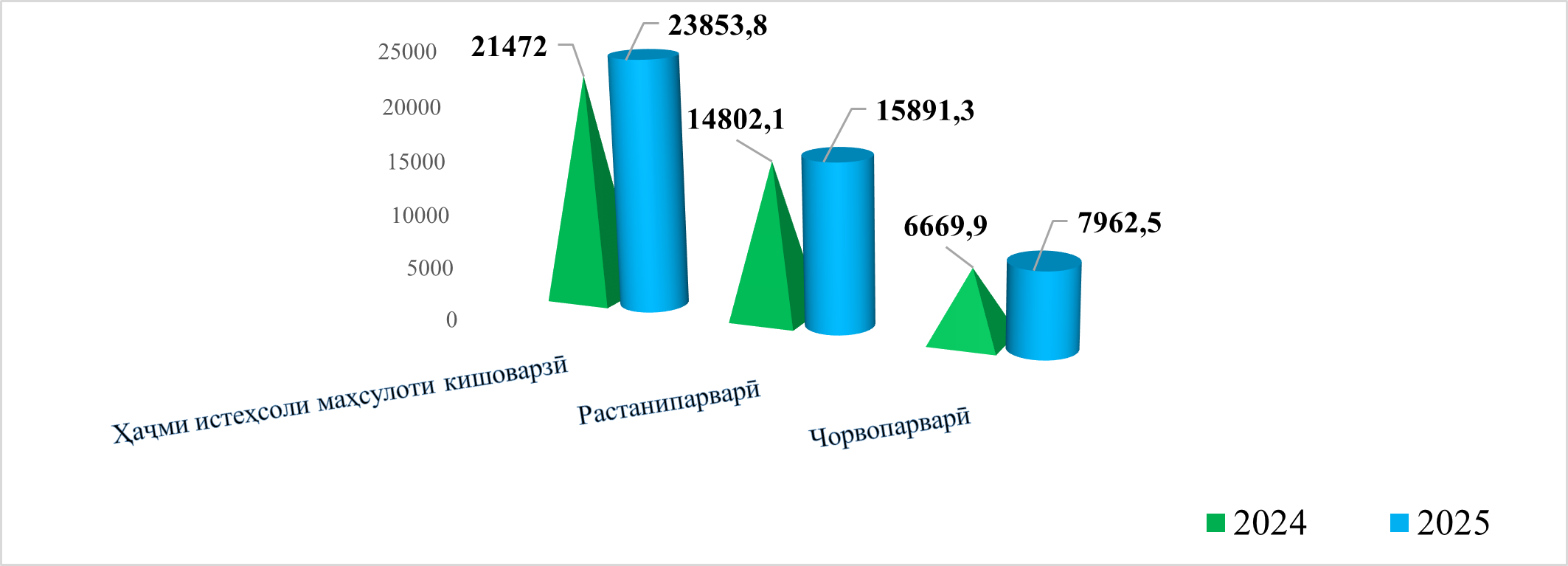 Дар давоми моҳҳои январ – июни соли 2025-ум дар ҳамаи шаклҳои хоҷагидорӣ ҳаҷми умумии маҳсулоти кишоварзӣ ба 23853,8 млн. сомонӣ баробар гардидааст, ки нисбат ба ҳамин давраи соли 2024-ум 9,7 дарсад зиёд мебошад. Бояд гуфт, ки афзоиши ҳаҷми истеҳсоли маҳсулоти кишоварзӣ асосан аз ҳисоби соҳаи растанипарварӣ ба маблағи 15891,3 млн. сомонӣ ё ин ки 9,0 дарсад, соҳаи чорводорӣ 7962,5 млн. сомонӣ ё 11,2 дарсад таъмин гардид ва дар ин давра ҳиссаи соҳаи кишоварзӣ дар ММД ба 15,9 дарсад баробар гардид.