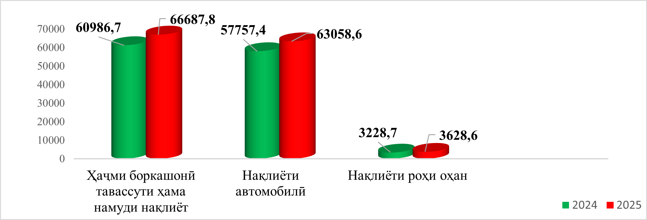 Бояд гуфт, ки давоми моҳҳои январ – июни соли 2025-ум дар қаламрави кишвар тавассути ҳама намуди нақлиёт 66687,8 ҳазор тонна бор кашонида шудааст, ки нисбат ба ҳамин давраи соли гузашта 9,3 дарсад зиёд мебошад. Дар давраи ҳисоботӣ тавассути нақлиёти автомобилӣ 63058,6 млн. тонна бор кашонида шудааст, ки нисбат ба нимсолаи аввали соли 2024-ум 9,2 дарсад зиёд мебошад. Тавассути нақлиёти роҳи оҳан 3628,6 млн. тонна бор кашонида шудааст, ки нисбат ба ҳамин давраи соли 2024-ум 12,4 дарсад зиёд мебошад.