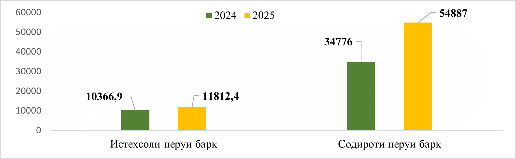 Дар давоми нимсолаи аввали соли 2025-ум ҳаҷми истеҳсол ва тақсимоти неруи барқ, газ ва тозакунии ҳаво ба маблағи 5612,1 млн. сомонӣ таъмин гардид, ки нисбат ба ҳамин давраи соли 2024-ум 956,3 млн. сомонӣ зиёд мебошад. Истеҳсоли неруи барқ дар нимсолаи аввали соли 2025-ум 11812,4 млн. кВт. соатро ташкил дода, нисбат ба ҳамин давраи соли 2024-ум 1445,5 млн. кВт. соат ё 3,9 фоиз афзоиш ёфт. Содироти неруи барқ бошад 54887 млн. долларро ташкил дода, нисбат ба ҳамин давраи соли 2024-ум мутаносибан 20111 млн. доллар зиёд гардидааст.