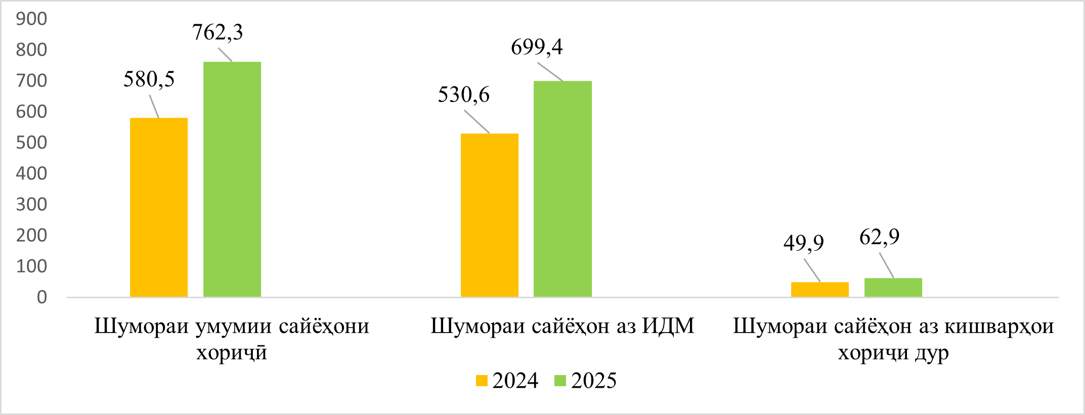 Аз шумораи умумии шаҳрвандони хориҷие, ки давоми моҳҳои январ – июни соли 2025-ум ба Ҷумҳурии Тоҷикистон ташриф овардаанд 762,3 ҳазор нафарашон ҳамчун сайёҳ (тибқи методологияи СУС) ба қайд гирифта шудаанд, ки нисбат ба ҳамин давраи соли гузашта 181,8 ҳазор нафар ё ин ки 31,3 дарсад афзоиш ёфтааст. Аз ин шумора 699,4 ҳазор нафар ба кишварҳои ИДМ, ки нисбат ба ҳамин давраи соли гузашта 168,8 ҳазор нафар ё 31,8 дарсад ва 62,9 ҳазор нафар ба кишварҳои хориҷи дур, ки нисбат ба ҳамин давраи соли 2024-ум 13 ҳазор нафар ё ин ки 26,0 дарсад афзоиш ёфтааст.