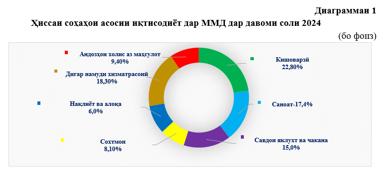 Аз рӯйи нишондиҳандаҳо мушоҳида карда мешавад, ки дар давоми соли 2024-ум ҳиссаи соҳаи савдои яклухт ва чакана, таъмири автомобилҳо, хизматрасонии меҳмонхонаҳо ба 15,2 дарсади ММД баробар гардидааст. Ғайр аз ин, ҳиссаи соҳаи сохтмон 12,4 млрд. сомонӣ ё ин ки 8,1 дарсад, соҳаҳои нақлиёт ва алоқа 14,3 млрд. сомонӣ ё ин ки 9,3 дарсад, андозҳои холис аз маҳсулот 14,4 млрд. сомонӣ ё ин ки 9,4 дарсад ва дигар намуди хизматрасонӣ 27,9 млрд. сомонӣ ё ин ки 18,3 фоизи ММД-ро ташкил намудааст.