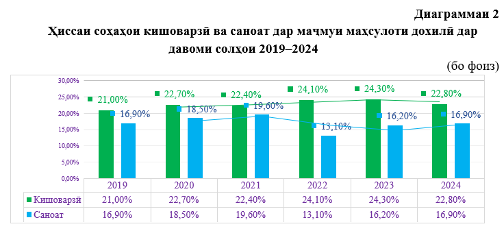Дар ин давра, яъне соли 2024-ум ҳаҷми истеҳсоли маҳсулоти кишоварзӣ дар ММД ба 34,9 млрд. сомонӣ баробар гардида, нисбат ба соли 2023-юм ба андозаи 10,1 дарсад афзоиш ёфт ва ҳиссаи ин соҳа дар ММД бештар аз 22,8 дарсадро ташкил намуд. Дар ин давра, истеҳсоли маҳсулоти саноатӣ дар ММД ба 25,9 млрд. сомонӣ баробар гардид, ки нисбат ба соли 2023-юм ба андозаи 22,6 дарсад афзоиш ёфта, ҳиссаи ин соҳа дар ММД ба 16,9 дарсад баробар гардид.