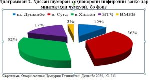 Диаграммаи 2. Ҳиссаи шумораи соҳибкорони инфиродии занҳо дар минтақаҳои ҷумҳурӣ, бо фоиз