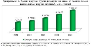 Ҳамзамон, ҳаҷми қарзҳои хурди додашуда ба занон аз ҷониби ташкилотҳои қарзии молиявӣ сол то сол афзоиш ёфта, дар соли 2025 ба 7808,82 млн. сомонӣ расид ва нисбат ба соли 2021 зиёда аз 2,4 баробар зиёд гардид.